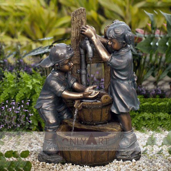 Bronze fountain sculpture of children playing outside